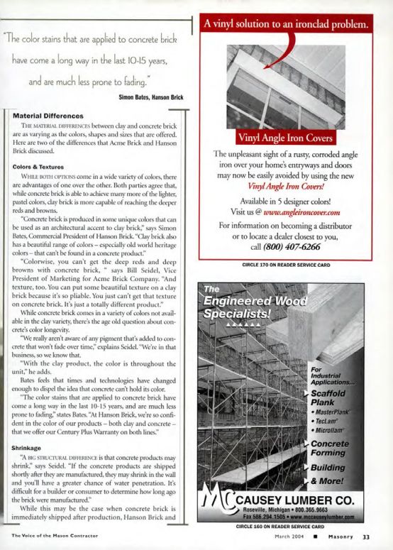 "A BIG STRUCTURAL DIFFERENCE is that concrete products may shrink," says Seidel. "If the concrete products are shipped shortly after they are manufactured, they may shrink in the wall and you'll have a greater chance of water penetration. It's difficult for a builder or consumer to determine how long ago the brick were manufactured."