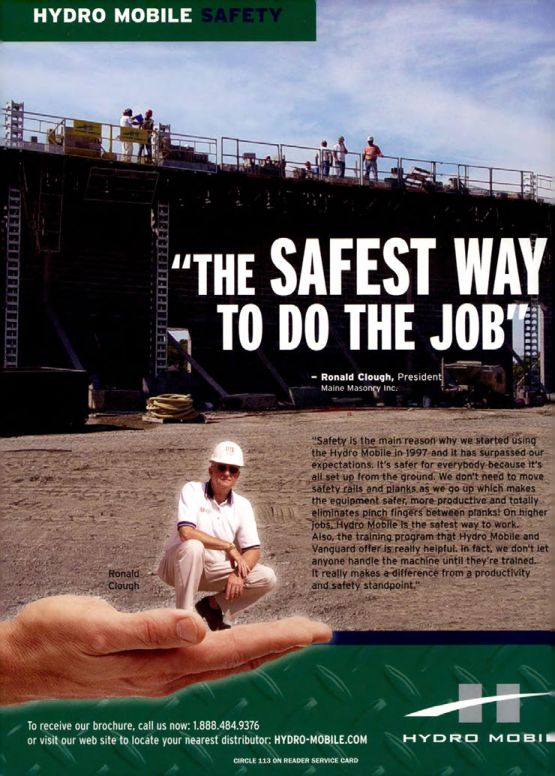 "Safety is the main reason why we started using the Hydro Mobile in 1997 and it has surpassed our expectations. It's safer for everybody because it's all set up from the ground. We don't need to move safety rails and planks as we go up which makes the equipment safer, more productive and totally eliminates pinch fingers between planks! On higher jobs, Hydro Mobile is the safest way to work. Also, the training program that Hydro Mobile and Vanguard offer is really helpful. In fact, we don't let anyone handle the machine until they're trained... It really makes a difference from a productivity and safety standpoint."