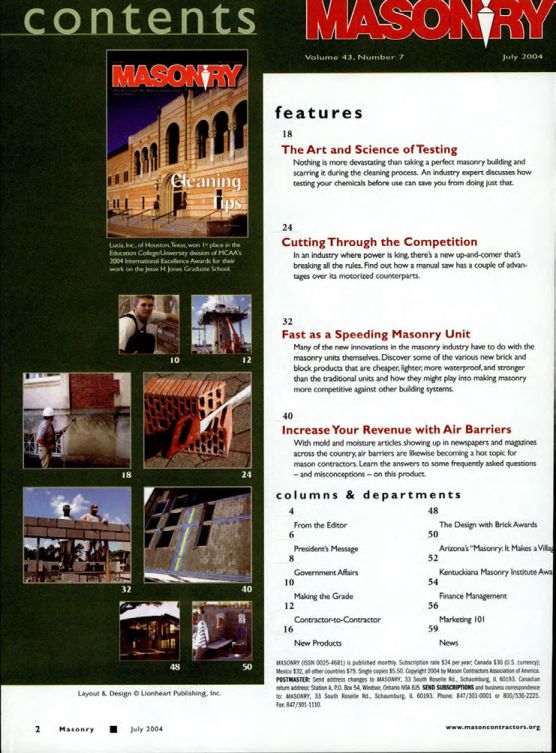 MASONRY (ISSN 0005-4681) is published monthly Subscription rate 524 per year, Canada $30 (US.cumency): Mexico $32, all other courtles $79. Single copies $5.50. Copyright 2004 by Mason Contractors Association of America