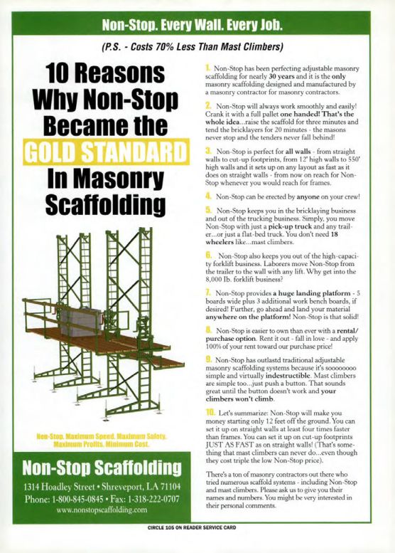 There's a ton of masonry contractors out there who tried numerous scaffold systems including Non-Stop and mast climbers. Please ask us to give you their names and numbers. You might be very interested in their personal comments.