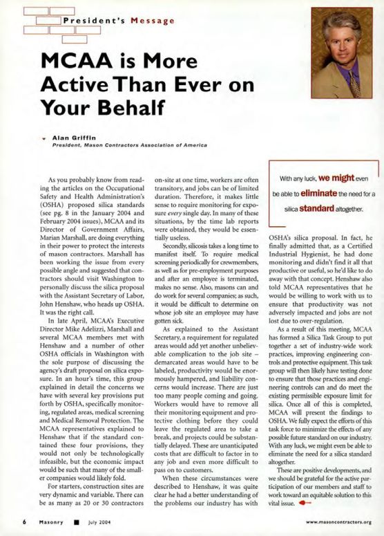 As you probably know from reading the articles on the Occupational Safety and Health Administration's (OSHA) proposed silica standards (see pg. 8 in the January 2004 and February 2004 issues), MCAA and its Director of Government Affairs, Marian Marshall, are doing everything in their power to protect the interests of mason contractors. Marshall has been working the issue from every possible angle and suggested that contractors should visit Washington to personally discuss the silica proposal with the Assistant Secretary of Labor, John Henshaw, who heads up OSHA. It was the right call.
