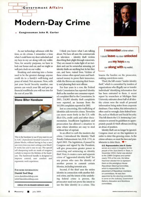 In an effort to curb the modern-day crime, I introduced the Identity Theft Penalty Enhancement Act, H.R. 1731, in April 2003. The legislation, if passed by Congress and signed by the President, will give prosecutors greater power in convicting and sentencing an identity thief. First, it creates a new and separate crime of "aggravated identity theft" for any person who uses the identity of another person to commit certain felonies, including terrorist acts.