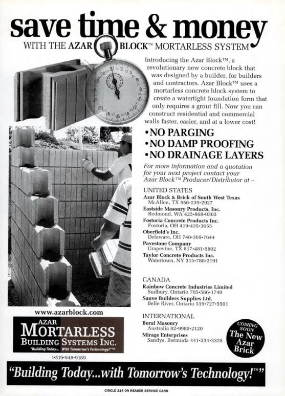 Introducing the Azar Block™™, a revolutionary new concrete block that was designed by a builder, for builders and contractors. Azar Block™™ uses a mortarless concrete block system to create a watertight foundation form that only requires a grout fill. Now you can construct residential and commercial walls faster, easier, and at a lower cost!