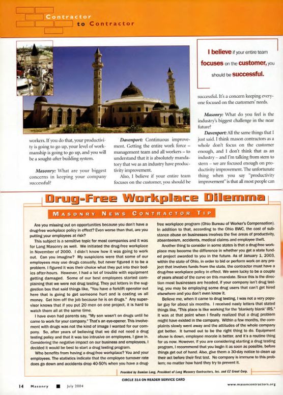 This subject is a sensitive topic for most companies and it was for Lang Masonry as well. We initiated the drug-free workplace in November of 2000. I didn't know how it was going to work out. Can you imagine? My suspicions were that some of our employees may use drugs casually, but never figured it to be a problem. I figured it was their choice what they put into their bodies after-hours. However, I had a lot of trouble with equipment getting damaged. Some of our best employees started complaining that we were not drug testing. They put letters in the suggestion box that said things like, "You have a forklift operator out here that is going to get someone hurt and is costing us all money. Get him off the job because he is on drugs." Any supervisor knows that if you put 20 men on one project, it is hard to watch them all at the same time.