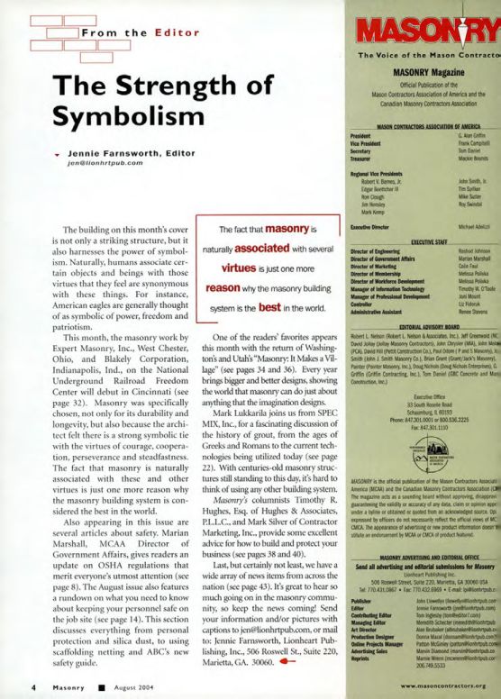 Last, but certainly not least, we have a wide array of news items from across the nation (see page 43). It's great to hear so much going on in the masonry community, so keep the news coming! Send your information and/or pictures with captions to jen@lionhrtpub.com, or mail to: Jennie Farnsworth, Lionheart Publishing, Inc., 506 Roswell St., Suite 220, Marietta, GA. 30060.