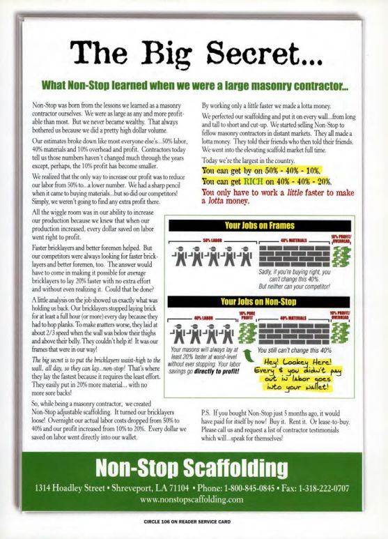 By working only a little faster we made a lotta money. We perfected our scaffolding and put it on every wall...from long and tall to short and cut-up. We started selling Non-Stop to fellow masonry contractors in distant markets. They all made a lotta money. They told their friends who then told their friends. We went into the elevating scaffold market full time.