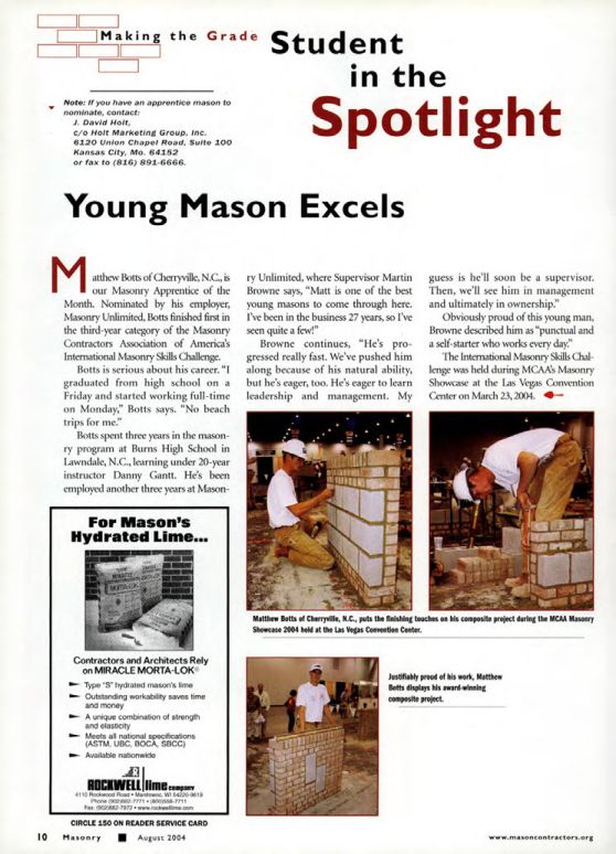 Botts spent three years in the masonry program at Burns High School in Lawndale, N.C., learning under 20-year instructor Danny Gantt. He's been employed another three years at Masonry Unlimited, where Supervisor Martin Browne says, "Matt is one of the best young masons to come through here. I've been in the business 27 years, so I've seen quite a few!"