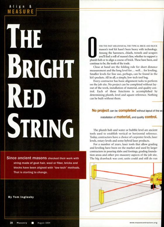 OVER THE PAST MILLENNIUM, THE TYPICAL BRICK AND BLOCK mason's tool kit hasn't been heavy with technology. Among the hammers, chisels, trowels and scrapers you'll find a roll of mason's line, whether to support a plumb bob or to align a course of brick. These have been, and continue to be, the tools of the trade.