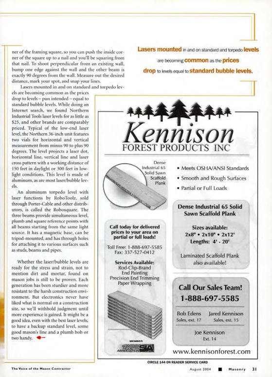 Whether the laser/bubble levels are ready for the stress and strain, not to mention dirt and mortar, found on mason jobs is still to be proven. Each generation has been sturdier and more resistant to the harsh construction environment. But electronics never have liked what is normal on a construction site, so we'll withhold judgment until more experience is gained. It might be a good idea, even with the best laser levels, to have a backup standard level, some good mason's line and a plumb bob or two handy.