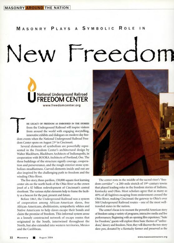 Several elements of symbolism are powerfully represented in the Freedom Center's architectural design by Walter Blackburn, Blackburn Architects of Indianapolis, in cooperation with BOORA Architects of Portland, Ore. The three buildings of the structure signify courage, cooperation and perseverance, and the rough exterior stone symbolizes steadfastness. Curved elements inside and out are also inspired by the challenging path to freedom and the winding Ohio River.