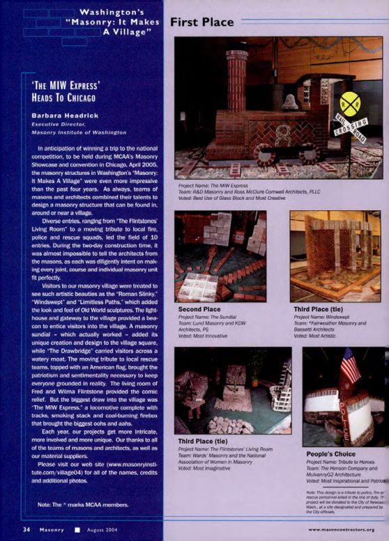 In anticipation of winning a trip to the national competition, to be held during MCAA's Masonry Showcase and convention in Chicago, April 2005, the masonry structures in Washington's "Masonry: It Makes A Village" were even more impressive than the past four years. As always, teams of masons and architects combined their talents to design a masonry structure that can be found in, around or near a village.