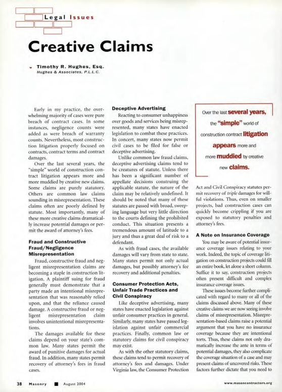 Over the last several years, the "simple" world of construction contract litigation appears more and more muddied by creative new claims. Some claims are purely statutory. Others are common law claims sounding in misrepresentation. These claims often are poorly defined by statute. Most importantly, many of these more creative claims dramatically increase potential damages or permit the award of attorney's fees.
