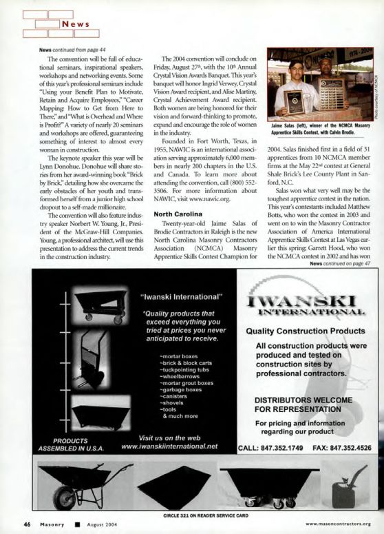 Salas won what very well may be the toughest apprentice contest in the nation. This year's contestants included Matthew Botts, who won the contest in 2003 and went on to win the Masonry Contractor Association of America International Apprentice Skills Contest at Las Vegas earlier this spring; Garrett Hood, who won the NCMCA contest in 2002 and has won