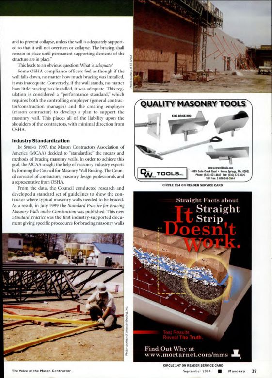 IN SPRING 1997, the Mason Contractors Association of America (MCAA) decided to "standardize" the means and methods of bracing masonry walls. In order to achieve this goal, the MCAA sought the help of masonry industry experts by forming the Council for Masonry Wall Bracing. The Council consisted of contractors, masonry design professionals and a representative from OSHA.