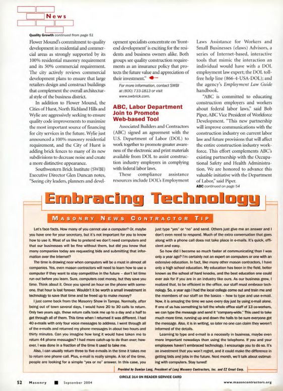 So how did I become so much faster at communicating than I was only a year ago? I'm certainly not an expert on computers or one with an extensive education. In fact, like many other mason contractors, I have only a high school education. My education has been in the field, better known as the school of hard knocks, and the best education one could ever ask for if you are in an industry like ours. As our business grew, I realized that, to be efficient in the office, our staff must embrace technology. So, a year ago I had the local college come out and train me and the members of our staff on the basics how to type and use e-mail. Now, it is amazing the time we save every day just by using e-mail alone. If one of us has something to tell the whole office staff of 13 co-workers, we can type the message and send it "company-wide." This used to take much more time, running up and down the halls to be sure everyone got the message. Also, it is in writing, so later no one can claim they weren't informed of the details.