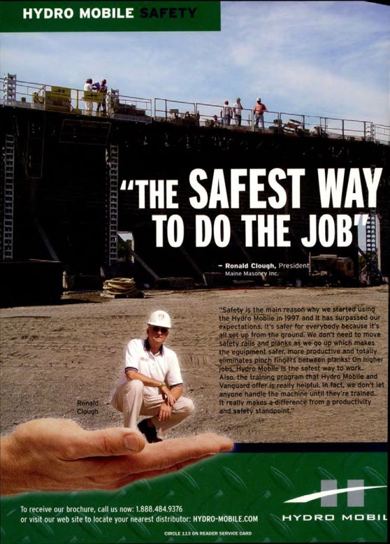 "Safety is the main reason why we started using the Hydro Mobile in 1997 and it has surpassed our expectations. It's safer for everybody because it's all set up from the ground. We don't need to move safety rails and planks as we go up which makes the equipment safer, more productive and totally eliminates pinch fingers between planks! On higher jobs, Hydro Mobile is the safest way to work. Also, the training program that Hydro Mobile and Vanguard offer is really helpful. In fact, we don't let anyone handle the machine until they're trained... It really makes a difference from a productivity and safety standpoint."