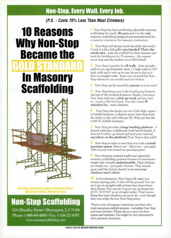 1. Non-Stop has been perfecting adjustable masonry scaffolding for nearly 30 years and it is the only masonry scaffolding designed and manufactured by a masonry contractor for masonry contractors.