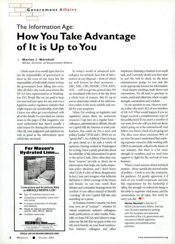 As business owners, I assume you have your own set of "sources" whether it's valued employees, industry colleagues, trade publications or other media. Naturally, we hope MCAA and Masonry magazine top the list! But my guess is that you rely most heavily on your local construction industry colleagues and office employees. Running a business is no small task, and I seriously doubt you have time to surf the web to check on the latest entertainment gossip. So you seek the most appropriate forums for information local chapter meetings, trade shows and conventions. We all tend to gravitate to events, social and otherwise, where we gain strength, camaraderie and wisdom.
