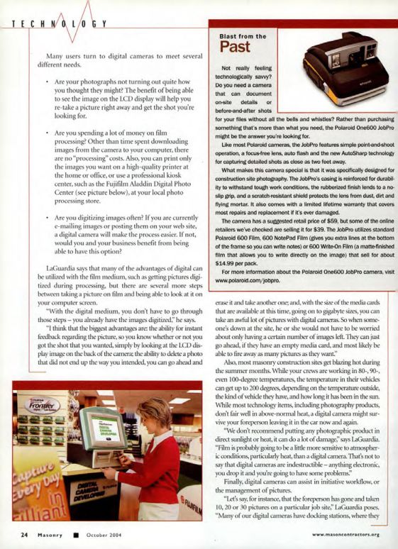 Not really feeling technologically savvy? Do you need a camera that can document on-site details or before-and-after shots for your files without all the bells and whistles? Rather than purchasing something that's more than what you need, the Polaroid One600 JobPro might be the answer you're looking for.