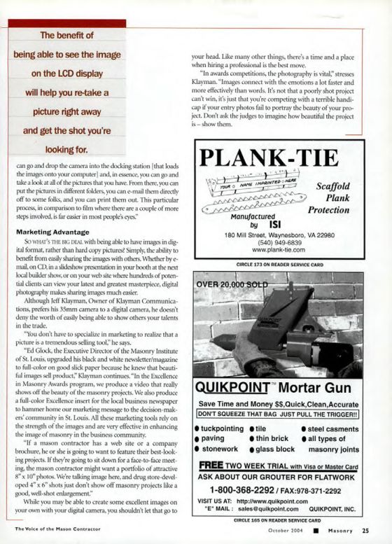 "If a mason contractor has a web site or a company brochure, he or she is going to want to feature their best-looking projects. If they're going to sit down for a face-to-face meeting, the mason contractor might want a portfolio of attractive 8" x 10" photos. We're talking image here, and drug store-developed 4" x 6" shots just don't show off masonry projects like a good, well-shot enlargement."