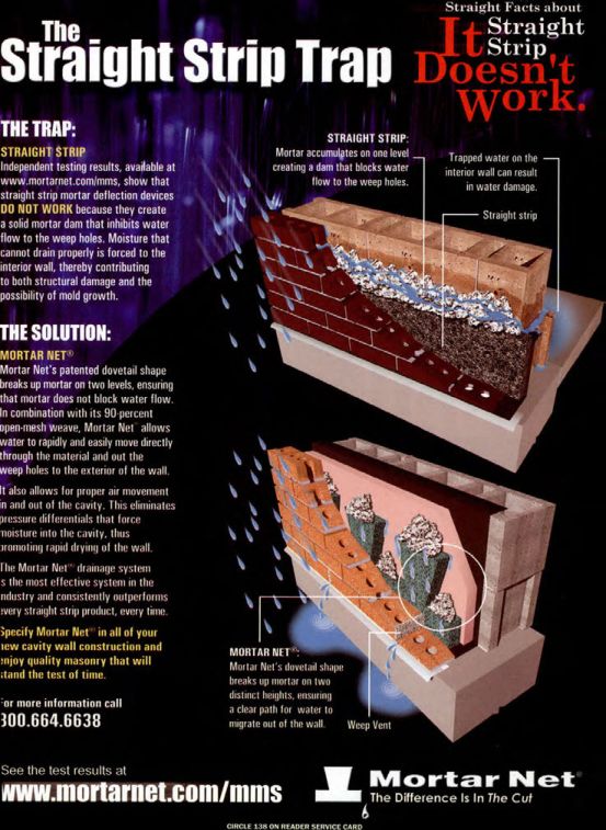 Independent testing results, available at www.mortarnet.com/mms, show that straight strip mortar deflection devices DO NOT WORK because they create a solid mortar dam that inhibits water flow to the weep holes. Moisture that cannot drain properly is forced to the interior wall, thereby contributing to both structural damage and the possibility of mold growth.