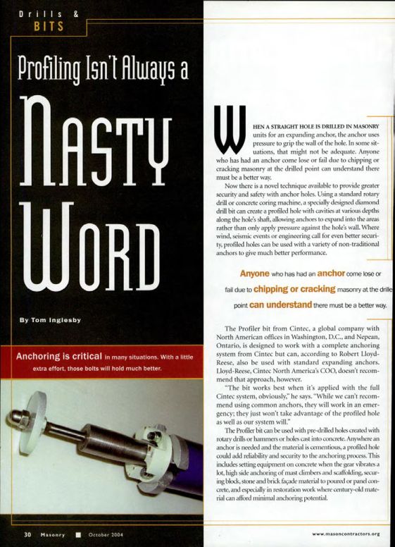 The Profiler bit from Cintec, a global company with North American offices in Washington, D.C., and Nepean, Ontario, is designed to work with a complete anchoring system from Cintec but can, according to Robert Lloyd-Reese, also be used with standard expanding anchors. Lloyd-Reese, Cintec North America's COO, doesn't recommend that approach, however.