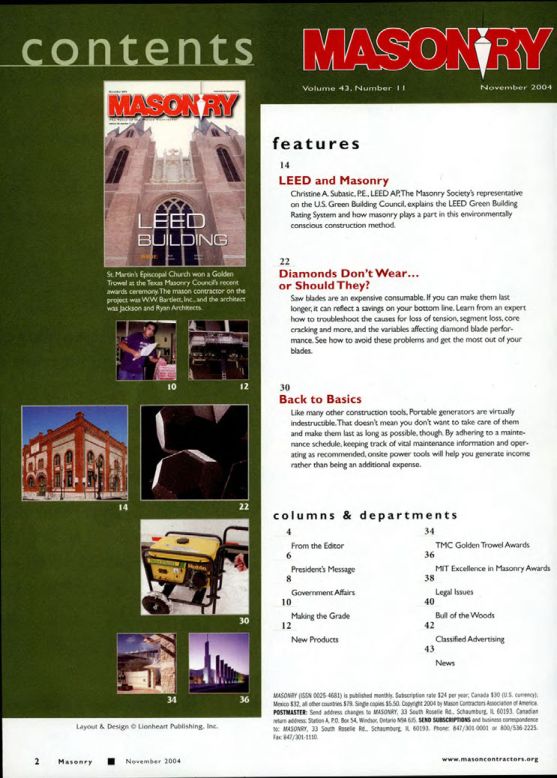 MASONRY (ISSN 0025-4681) is published monthly. Subscription rate $24 per year, Canada $30 (U.S. currency): Mexico $32, all other countries $79. Single copies $5.50. Copyright 2004 by Mason Contractors Association of America. POSTMASTER: Send address changes to MASONRY, 33 South Roselle Rd., Schaumburg, IL 60193. Canadian return address: Station A, P.O. Box 54, Windsor, Ontario NSA 6J5. SEND SUBSCRIPTIONS and business correspondence to: MASONRY, 33 South Roselle Rd., Schaumburg, IL 60193. Phone: 847/301-0001 or 800/536-2225. Fax: 847/301-1110.