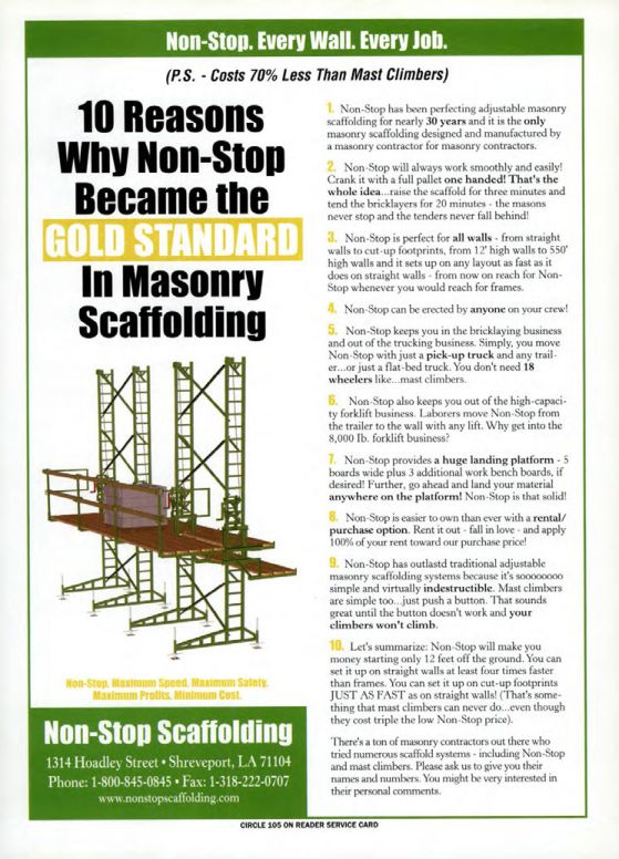 There's a ton of masonry contractors out there who tried numerous scaffold systems including Non-Stop and mast climbers. Please ask us to give you their names and numbers. You might be very interested in their personal comments.