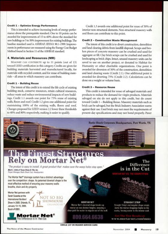MASONRY CAN CONTRIBUTE up to 11 points (out of 13) toward LEED certification in this category. Credits are given for building materials harvested and manufactured locally, for materials with recycled content, and for reuse of building materials-all areas to which masonry can contribute.