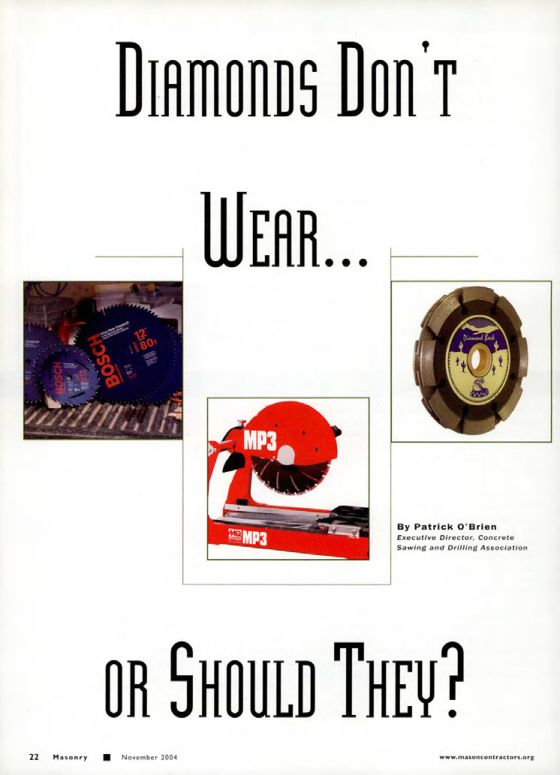 Masonry Magazine November 2004 Page. 24 Masonry Magazine November 2004 Page. 24 DIAMONDS DON'T WEAR...BOSCHBOSCH12180MP3MP3By Patrick O'BrienExecutive Director, ConcreteSawing and Drilling AssociationOR SHOULD THEY?22MasonryNovember 2004www.masoncontractors.org