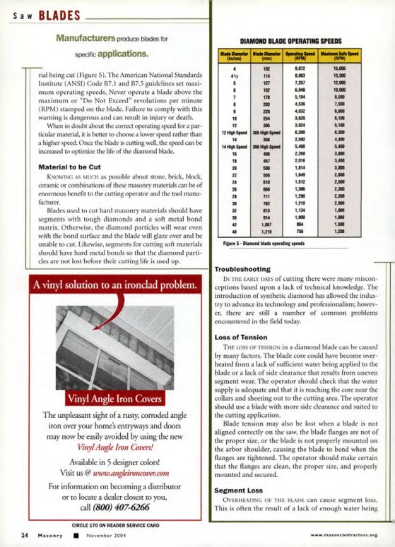 THE LOSS OF TENSION in a diamond blade can be caused by many factors. The blade core could have become overheated from a lack of sufficient water being applied to the blade or a lack of side clearance that results from uneven segment wear. The operator should check that the water supply is adequate and that it is reaching the core near the collars and sheeting out to the cutting area. The operator should use a blade with more side clearance and suited to the cutting application.