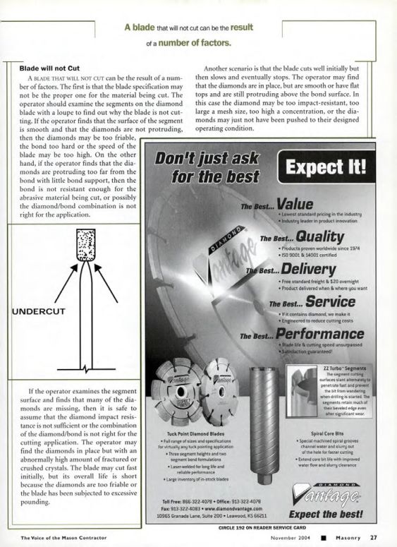 A BLADE THAT WILL NOT CUT can be the result of a number of factors. The first is that the blade specification may not be the proper one for the material being cut. The operator should examine the segments on the diamond blade with a loupe to find out why the blade is not cutting. If the operator finds that the surface of the segment is smooth and that the diamonds are not protruding, then the diamonds may be too friable, the bond too hard or the speed of the blade may be too high. On the other hand, if the operator finds that the diamonds are protruding too far from the bond with little bond support, then the bond is not resistant enough for the abrasive material being cut, or possibly the diamond/bond combination is not right for the application.