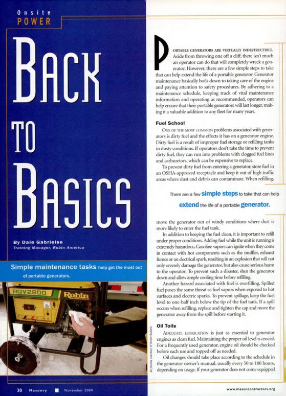 PORTABLE GENERATORS ARE VIRTUALLY INDESTRUCTIBLE. Aside from throwing one off a cliff, there isn't much an operator can do that will completely wreck a generator. However, there are a few simple steps to take that can help extend the life of a portable generator. Generator maintenance basically boils down to taking care of the engine and paying attention to safety procedures. By adhering to a maintenance schedule, keeping track of vital maintenance information and operating as recommended, operators can help ensure that their portable generators will last longer, making it a valuable addition to any fleet for many years.