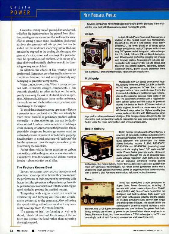 Robin Subaru introduces the Power Series, a new line of automatic voltage regulation (AVR) portable generators known for high performance, quiet operation and ease-of-use. The Power Series includes models R1100, RG2800DX, RG3200DX and RG4300DX, generating maximum outputs ranging from 1,100 watts to 4,300 watts. Power Series generators offer clean and stable power through the use of advanced automatic voltage regulation (AVR) technology. Utilizing an exclusive advanced reverse cooling technology, the Robin Subaru Power Series generators also run quieter than most AVR generator technologies. All Power Series generators come with a unique one-touch control system that allows all engine functions to be controlled with a tum of a dial. For more information, visit www.robinsubaru.com.