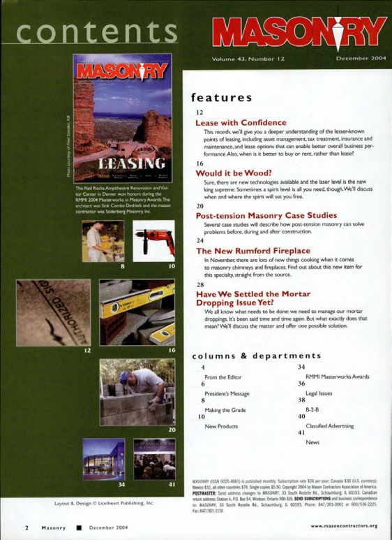MASONRY (ISSN 0025-4681) is published monthly. Subscription rate $24 per year: Canada $30 (US. currency): Mexico $32, all other countries $79. Single copies $5.50. Copyright 2004 by Mason Contractors Association of America.