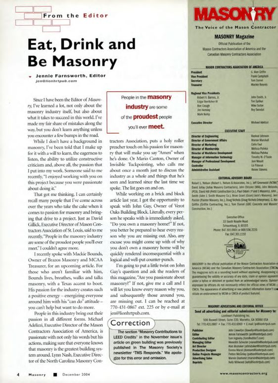 I'm going to put a little twist on John Guy's question and ask the readers of this magazine, "Are you passionate about masonry?" If not, give me a call and I will let you know every reason why you, and subsequently those around you, are missing out. I can be reached at 770-431-0867 ext. 225 or by e-mail at jen@lionhrtpub.com.