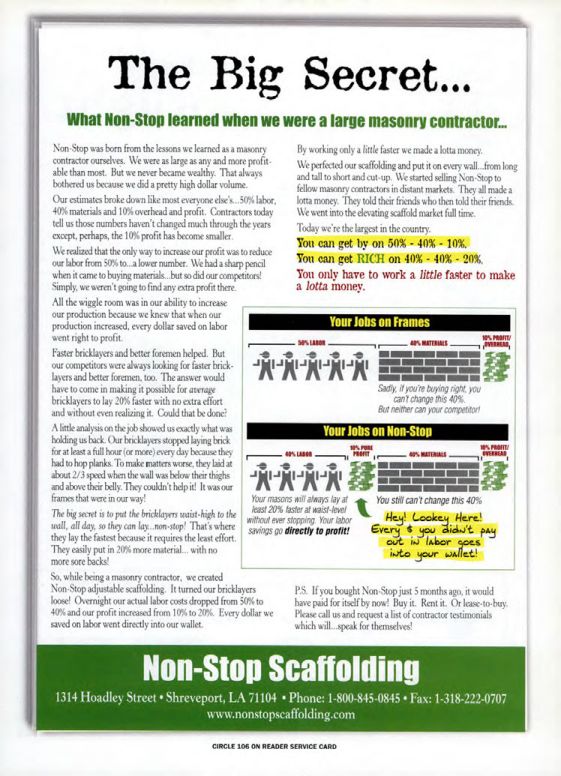 By working only a little faster we made a lotta money. We perfected our scaffolding and put it on every wall...from long and tall to short and cut-up. We started selling Non-Stop to fellow masonry contractors in distant markets. They all made a lotta money. They told their friends who then told their friends. We went into the elevating scaffold market full time. Today we're the largest in the country.