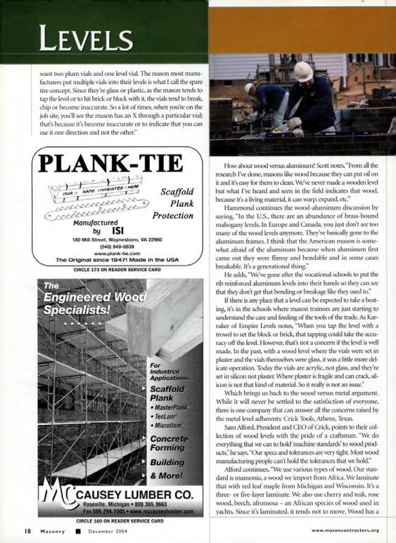 Hammond continues the wood-aluminum discussion by saying, "In the U.S., there are an abundance of brass-bound mahogany levels. In Europe and Canada, you just don't see too many of the wood levels anymore. They've basically gone to the aluminum frames. I think that the American mason is somewhat afraid of the aluminum because when aluminum first came out they were flimsy and bendable and in some cases breakable. It's a generational thing."
