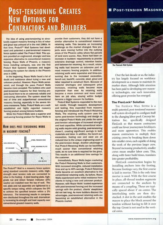 The idea of using post-tensioning to structurally support masonry fencing in lieu of rebar and grout was unheard of in the mid 1980s. At that time, Proto-II™ Wall Systems had developed and patented a post-tensioned masonry fence system called The Proto-Il Wall. This system provided an engineered, stronger and less expensive alternative to conventional masonry fencing, Royce Walls of Phoenix, a masonry fence installing company, was one the first Proto-ll Wall Systems' licensees and began installing the system for clients in the Phoenix area in 1986.