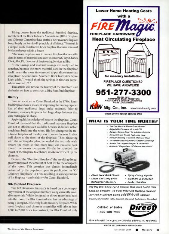 Taking queues from the traditional Rumford fireplace, members of the Brick Industry Association's (BIA) Fireplace and Chimney Committee have crafted a new masonry fireplace based largely on Rumford's principle of efficiency. The result is a simple, easily constructed brick fireplace that uses minimal bricks and space within a house.