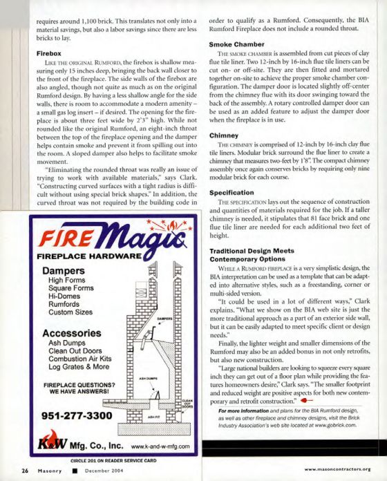 For more information and plans for the BIA Rumford design, as well as other fireplace and chimney designs, visit the Brick Industry Association's web site located at www.gobrick.com.