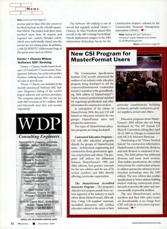 Education programs about Master-Format's 2004 edition also are being developed for The 49th Annual CSI Show & Convention, taking place April 20-23, 2005 in Chicago, in conjunction with MCAA's Masonry Showcase.