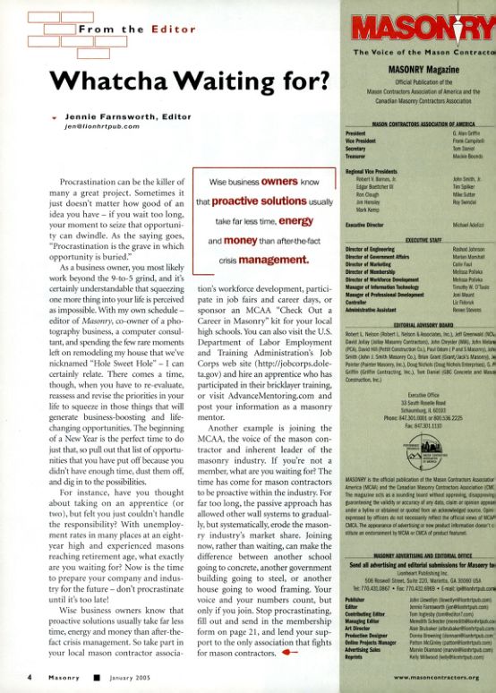 Another example is joining the MCAA, the voice of the mason contractor and inherent leader of the masonry industry. If you're not a member, what are you waiting for? The time has come for mason contractors to be proactive within the industry. For far too long, the passive approach has allowed other wall systems to gradually, but systematically, erode the masonry industry's market share. Joining now, rather than waiting, can make the difference between another school going to concrete, another government building going to steel, or another house going to wood framing. Your voice and your numbers count, but only if you join. Stop procrastinating, fill out and send in the membership form on page 21, and lend your support to the only association that fights for mason contractors.