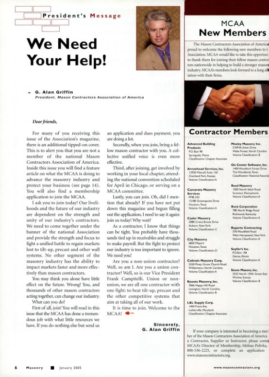 I ask you to join today! Our livelihoods and the future of our industry are dependent on the strength and unity of our industry's contractors. We need to come together under the banner of the national Association and provide the strength and focus to fight a unified battle to regain markets lost to tilt-up, precast and other wall systems. No other segment of the masonry industry has the ability to impact markets faster and more effectively than mason contractors.
