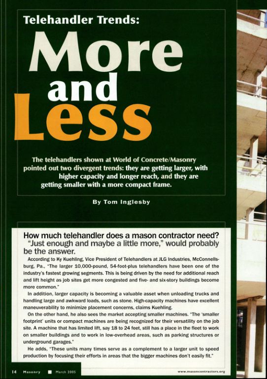 The telehandlers shown at World of Concrete/Masonry pointed out two divergent trends: they are getting larger, with higher capacity and longer reach, and they are getting smaller with a more compact frame.