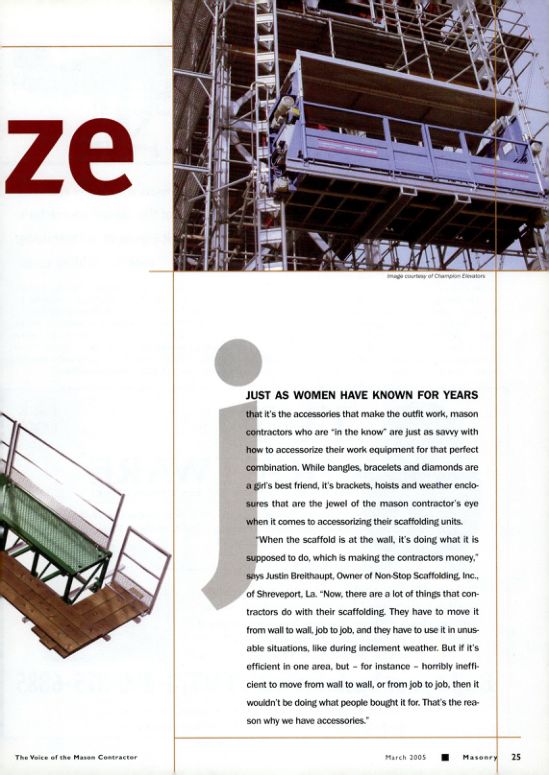 JUST AS WOMEN HAVE KNOWN FOR YEARS that it's the accessories that make the outfit work, mason contractors who are "in the know" are just as savvy with how to accessorize their work equipment for that perfect combination. While bangles, bracelets and diamonds are a girl's best friend, it's brackets, hoists and weather enclosures that are the jewel of the mason contractor's eye when it comes to accessorizing their scaffolding units.