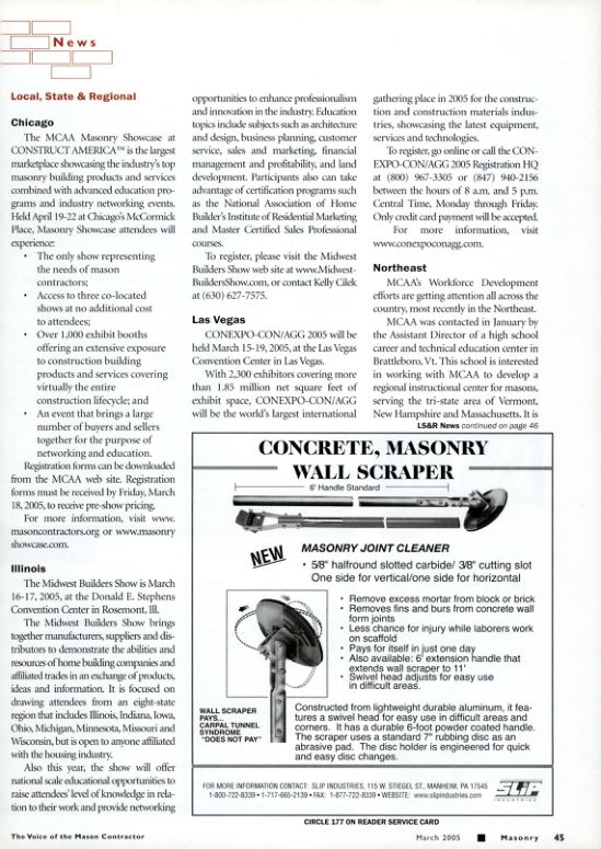 MCAA was contacted in January by the Assistant Director of a high school career and technical education center in Brattleboro, Vt. This school is interested in working with MCAA to develop a regional instructional center for masons, serving the tri-state area of Vermont, New Hampshire and Massachusetts. It is LS&R News continued on page 46