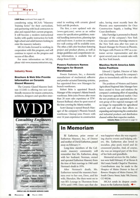 Long-time members of the Colorado masonry community will remember that Ms. Eatherton, along with her husband, Norman, owned and operated Eatherton Masonry from the time of their marriage in 1960 until Norman's death in 1976.