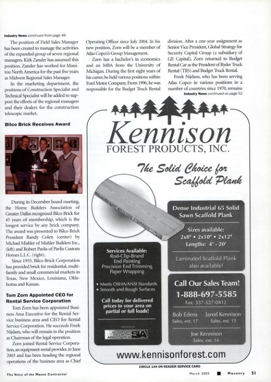 During its December board meeting, the Home Builders Association of Greater Dallas recognized Bilco Brick for 45 years of membership, which is the longest service by any brick company. The award was presented to Bilco Brick President Randy Colen (center) by Michael Mishler of Mishler Builders Inc., (left) and Robert Pavlis of Pavlis Custom Homes L.L.C. (right).