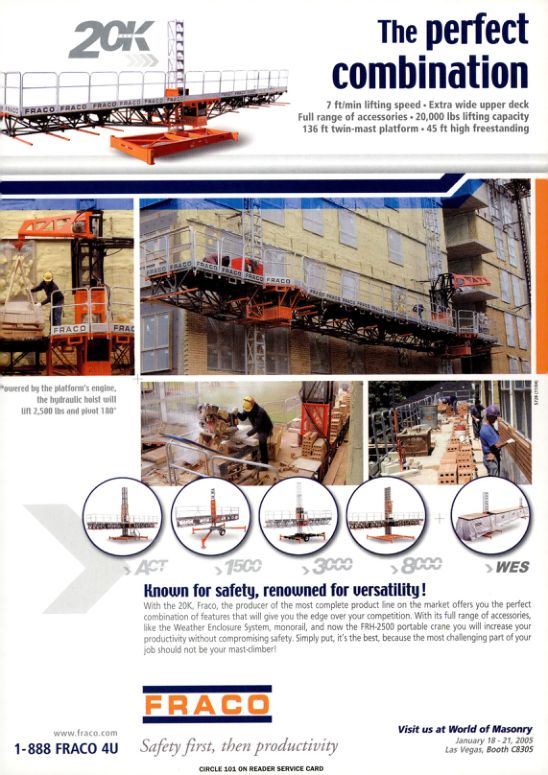 With the 20K, Fraco, the producer of the most complete product line on the market offers you the perfect combination of features that will give you the edge over your competition. With its full range of accessories, like the Weather Enclosure System, monorail, and now the FRH-2500 portable crane you will increase your productivity without compromising safety. Simply put, it's the best, because the most challenging part of your job should not be your mast-climber!